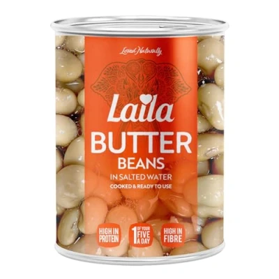 Butter Beans in Salted Water Source of Fibre High in Protein 80g of this product drained will provide 1 of your 5 daily portions of fruit and vegetables. For tasty recipes made with Laila products visit us at: Lailafoods.com