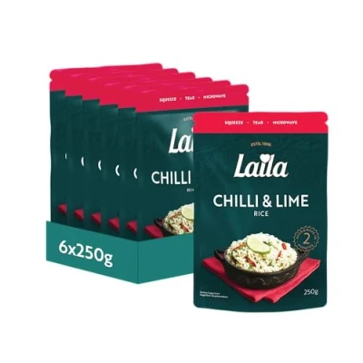 Laila Chilli and Lime - Convenient ready-to-heat packs with a zesty chilli and lime flavor, perfect for quick meals. Quick & Convenient - Ready in just 2 minutes in the microwave - perfect for busy days. Versatile Side or Main - Great with grilled meats, veggies, or as a filling for burritos and wraps Family Pack - 6 x 250g packs, ideal for stocking up or meal prepping for the week Fluffy Basmati Rice - Made with premium-quality basmati rice for a light, aromatic texture in every bite.
