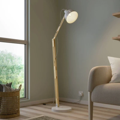Skansen floor lamp: industrial design meets flexibility and elegance The Skansen floor lamp combines industrial design with an elegant combination of wood and metal. This stylish light fits seamlessly into living rooms and dining rooms, adding a modern touch. The light wood look combined with the white finish creates a harmonious yet striking appearance that gives any room a special touch. A standout feature of the Skansen floor lamp is its movable frame and adjustable lampshade, which allow the light source to be flexibly adjusted. This functionality not only offers individual lighting, but also the possibility to specifically influence the atmosphere in the room. Manufactured in Europe, the lamp stands for quality and thoughtful design that is both aesthetically pleasing and functional.