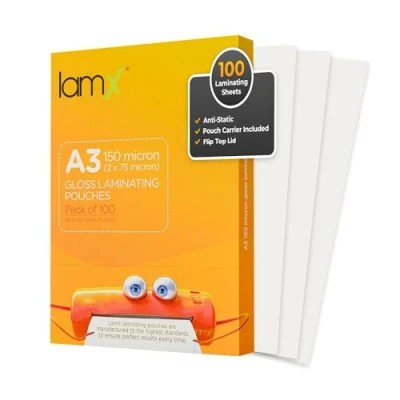 LamX A3 Laminating Pouches 150micron, High Gloss Finish Sheets, Anti Static Formula A3, 150 Micron (75+75 Micron) Pack of 100 Free Pouch Carrier Included