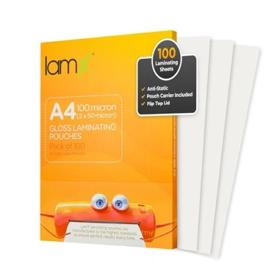 HIGH QUALITY LAMINATE POUCHES A4 100 MICRON: with STATIC FREE properties making these laminating pouches quick and easy to use in a busy office or school environment. No more 'uncontrollable' pouches! LAMINATOR SHEETS A4 IN A HIGH GLOSS FINISH: Designed with rounded corners for a smart safe final result. 2mm border rim and 1 sealed end to align your laminating paper within the laminating sheet. 100 LAMINATING SHEETS + 1 FREE POUCH CARRIER COVER IN EACH PACK: Perfect for busy offices or school environments and handling of multi-projects. Compatible with all standard lamination machine brands DURABLE LAMINATING POUCHES A4: All LAMX lamination pouches A4 provide long-lasting protection for multiple documents against general wear and tear, moisture and spillages, colour fading and so much more. THIS PACK CONTAINS 100 MICRON A4 LAMINATING POUCHES 100 PACK: (50 x 50 micron) making a strong, durable finished result once laminated. Great for medium duty projects or wall posters