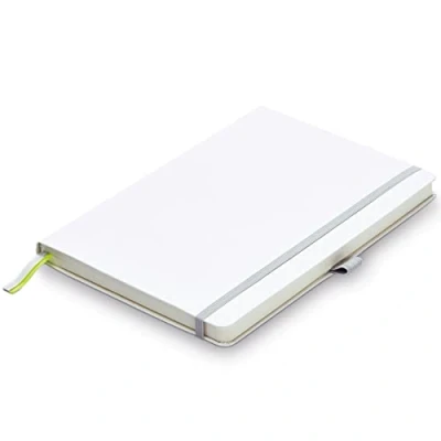 Available in the following colours: black, blue, pink, green, white and umber: DIN A5 (145 x 210 mm) and DIN A6 (102 x 144 mm) 192 pages of 90 g/m² with lamy ruling in chamois colour, 8 sheets can be separated The notebook has a practical loop for writing instruments and 2 bookmarks The book also has an elastic closure band and a folding pocket in the cover Ink-proof paper quality made from acid-free paper
