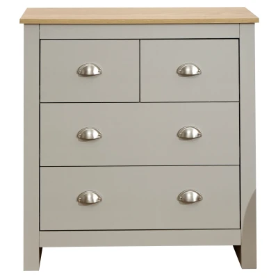 LANCASTER 2+2 DRAWER CHEST GREY by GFW. Designed to look the part and made to last Ñ A stylish shaker-inspired chest of drawers thatÕs perfect for kitting out a bedroom in first-class style. The sleek lines, soft grey or cream foiled finish with oak tops and brushed steel handles create a sophisticated impression. The chest of drawers provides effective storage with 2 small drawers and 2 large drawers. Ideal for a room where understated elegance is the goal.. Crafted from particle board, mdf Finish: Paper Foil Colour: Grey, Oak Includes clear assembly instructions Product Details Dimensions: 81cm (H) x 79cm (W) x 35cm (D) Material: Particle Board, MDF Finish: Paper Foil Colour: Grey Secondary Colour: Oak Finish the look with pieces from our drawers. Explore more in bedroom furniture.