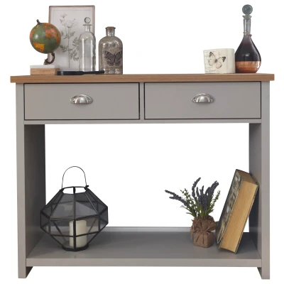 LANCASTER CONSOLE HALL TABLE GREY by GFW. Designed to look the part and made to last Ñ Part of our stylish new downstairs range, the Lancaster console hall table is available in a modern soft grey finish with contrasting oak veneer top. Excellent value for money and a fantastic focal point for your hallway, the Lancaster console hall table has two handy drawers with satin silver handles and a usefully large shelf underneath.. Crafted from particle board Finish: Paper Foil Colour: Grey, Oak Includes clear assembly instructions Product Details Dimensions: 76cm (H) x 97cm (W) x 35cm (D) Material: Particle Board Finish: Paper Foil Colour: Grey Secondary Colour: Oak Finish the look with pieces from our bedroom furniture. Explore more in living room furniture.