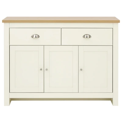 LANCASTER LARGE SIDEBOARD CREAM by GFW. Designed to look the part and made to last Ñ An elegant storage solution for the living or dining room. The Lancaster Large Sideboard, with its matte grey or cream finish and oak veneered top matches perfectly with the rest of the Lancaster range and features two handy drawers with satin silver handles and a spacious triple door cupboard underneath fitted with satin silver knobs.. Crafted from particle board Finish: Paper Foil Colour: Cream, Oak Includes clear assembly instructions Product Details Dimensions: 82cm (H) x 111.7cm (W) x 35cm (D) Material: Particle Board Finish: Paper Foil Colour: Cream Secondary Colour: Oak Finish the look with pieces from our bedroom furniture. Explore more in living room furniture.