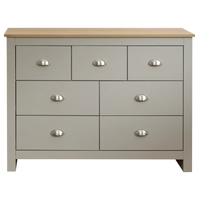 LANCASTER MERCHANTS CHEST GREY by GFW. Designed to look the part and made to last Ñ A stylish shaker-inspired merchants chest of drawers thatÕs perfect for kitting out a bedroom in first-class style. The sleek lines, soft grey or cream foiled finish with oak tops and brushed steel handles create a sophisticated impression. The merchants chest provides effective storage with 3 small drawers above 4 large drawers. Ideal for a room where understated elegance is the goal.. Crafted from particle board, mdf Finish: Paper Foil Colour: Grey, Oak Includes clear assembly instructions Product Details Dimensions: 81cm (H) x 111.5cm (W) x 35cm (D) Material: Particle Board, MDF Finish: Paper Foil Colour: Grey Secondary Colour: Oak Finish the look with pieces from our drawers. Explore more in bedroom furniture.