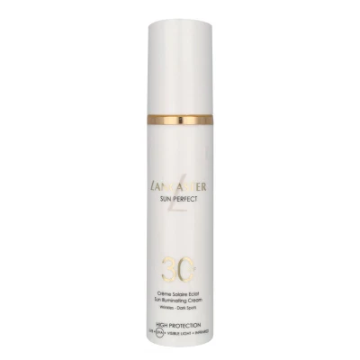Lancaster Sun Perfect Illuminating Cream SPF30 (50ml) offers ultra-broad spectrum sun protection with anti-aging benefits, reducing wrinkles, fine lines, and dark spots. Its lightweight vegan formula delivers a luminous finish, making it ideal for daily use and as a makeup base.