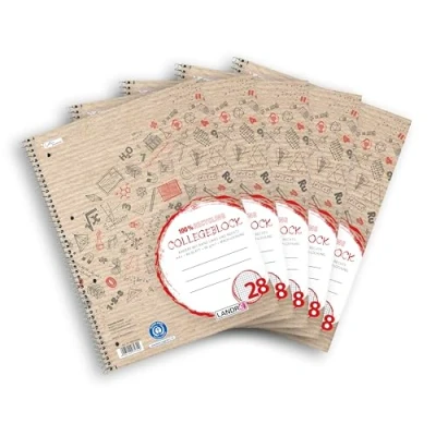 5 college pads, perforated, 4-hole punched with 80 sheets (160 writable pages) per pad, recycled Squared with margins right and left (= line style 28), for notes or corrections on the margin Recycled paper, made from 100% recycled paper - protects forests and valuable resources The robust spiral binding allows 360° turning and high flexibility The cover recycled from 100% recycled paper and the robust grey cardboard back provide additional writing comfort and stand for sustainability and environmental protection