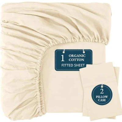 LANE LINEN 100% Organic Cotton Fitted Sheet Double Bottom with 2 Pillowcases, Soft & Breathable, 35 cm Deep Pocket, All Around Elastic Ivory