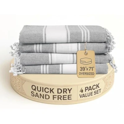 Sand Free Beach Towel: No more sandy beach towels with Lane Linen’s specially designed cotton rich towels and included beach bag for a truly sand-free experience. Just give it a quick shake and you're done—ideal for seaside holidays, poolside lounging, and sunny days at the park. Lightweight Travel Towel: Our Pack of 4 oversized towels (39" x 71") is compact and lightweight, making them a breeze to pack in your luggage or gym bag. Folds down small, yet big on coverage—perfect as a travel towel, beach blanket, or even an impromptu shawl for breezy evenings. Multipurpose Towel: Lane Linen’s cotton rich (70% cotton, 30% polyester) towels are soft, quick-drying, and absorbent—pre-washed for comfort right out of the bag. Use it as a camping towel, yoga mat cover, sarong, picnic blanket, pool towel, or stylish Turkish beach towel. One towel, endless uses. Care Instructions: When it’s time to clean, simply toss your towel into the washing machine and dryer. These towels are made in an OEKO-TEX Standard 100 certified facility, ensuring they meet high standards for environmental and human safety—because peace of mind matters. Satisfaction Guaranteed: We guarantee you'll love your Lane Linen towels. Our dedication to style, comfort, and customer satisfaction means we’ll always go the extra mile. If for any reason you’re not fully happy, we’ll make it right—because quality and service are never optional.