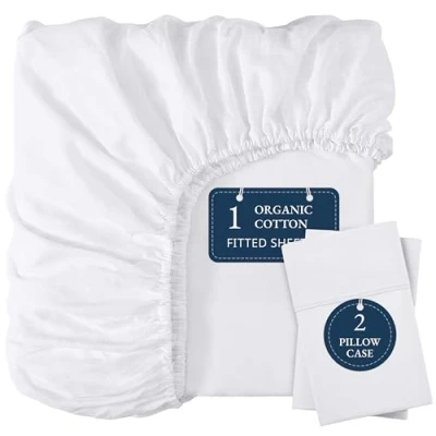 ULTRA-SOFT FITTED SHEETS: GOTS-certified 100% organic cotton fitted sheet and 2 pillowcases for luxurious, natural comfort. Crafted from crisp percale weave, this breathable and ultra-soft bedding keeps you cool and cozy throughout the night. Includes 1 Double Fitted Sheet (135 x 190 cm, 35 cm Deep Pocket) and 2 Standard Pillowcases (50 x 75 cm) with envelope closure. PERFECT FIT WITH DEEP POCKET: Tailored with an all-round strong elastic, this Double size fitted sheet ensures a snug, slip-resistant fit for mattresses up to 35 cm deep. Ideal for memory foam, pillow-top, or standard mattresses, it stays securely in place—no more bunching or riding up during the night. BREATHABLE, SKIN-FRIENDLY & COOLING: Gentle on sensitive skin, this hypoallergenic fitted sheet is lightweight, breathable, and moisture-wicking—ideal for hot sleepers. The percale weave enhances airflow and keeps you cool, while becoming softer with every wash for long-lasting comfort. ECO-FRIENDLY & SAFE FOR YOUR FAMILY: Made to the highest safety and sustainability standards, this fitted sheet is GOTS-certified, BSCI-compliant, and OEKO-TEX Standard 100 certified. Free from harmful chemicals, it offers a cleaner, safer sleeping environment for the whole family. EASY CARE & MACHINE WASHABLE: Built for everyday life, this organic cotton fitted sheet is machine washable, durable, and easy to care for. Simply wash cold, tumble dry low, and avoid bleach to preserve its softness. Pair it with Lane Linen's matching duvet covers to complete your effortlessly elegant bedding set.