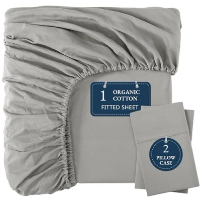 Lane Linen King Fitted Sheet 100% Organic Cotton, Soft & Breathable with 2 Pillowcases, 35cm Deep Pocket, All Round Elastic Bottom Silver