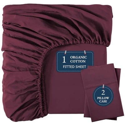 LANE LINEN Organic Cotton King Fitted Sheet Ultra Soft & Breathable with 2 Pillow Covers, 35cm Deep Pocket, Elastic Edges Bottom Windsor Wine
