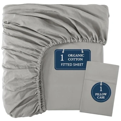 Lane Linen Single Fitted Sheet 100% Organic Cotton Bottom with 2 Pillow Covers, Ultra Soft & Breathable, 35cm Deep Pocket, Elastic Edges for Secure Fit Silver