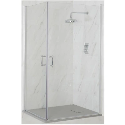 Langley Traditional Chrome Corner Walk In Wet Room Double Hinged Door Shower Enclosure with Light Grey Slate Effect Tray and Fast Flow Waste