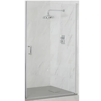 Langley Traditional Chrome Wet Room Walk In Hinged Door Frameless Shower Enclosure with Light Grey Slate Effect Tray and Fast Flow Waste 900mm x