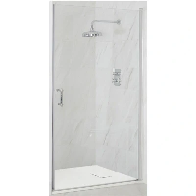 Langley Traditional Chrome Wet Room Walk In Hinged Door Frameless Shower Enclosure with White Slate Effect Tray and Fast Flow Waste 900mm x