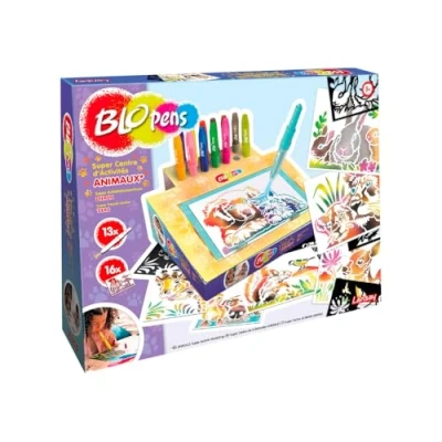 Creative pack for children aged 5 and up: The Blopens Super Activity Center Animals transforms any painting session into a fun adventure. Includes a cardboard desk, 13 Blops colouring pens and 16 animal themed stencils. UNIQUE AEROGRAPH EFFECT Immerse yourself in a world of colours and shapes where every breath transforms a simple leaf into a work of art. Perfect for children who want to explore their creativity, this set of colouring pens and stencils provides a playful and educational introduction to the art of drawing and painting. REUSABLE AND EASY TO CLEAN: All stencils are reusable and the caps of the Blops colouring pens are washable, which makes cleaning easier after use. This system promotes a stress-free and environmentally friendly art experience. BOX CONVERTIBLE INTO DARTISTIC PUPPITURE: The Super Activity Centre doubles up with an intelligent storage box in which all blopens, stencils and sheets can be carefully stored. This sophisticated design ensures an organised work area and easy transport. An all-in-one solution for drawing and painting. Gift idea for children 5 years: This craft set consists of a cardboard desk, 13 blopens pens, 16 different stencils and 16 drawing sheets and offers a range of tools that promote creativity. Each element is designed to inspire and allow for a variety of artistic creations.