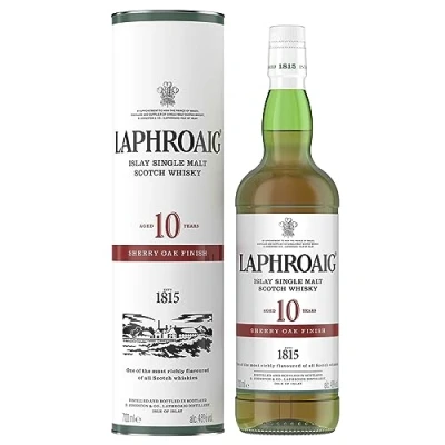 Laphroaig 10 Year Old Sherry Oak Single Malt Peated Scotch Whisky is aged for ten years and finished in sherry casks, this unique Laphroaig expression combines the unforgettable flavour of our classic 10 year old whisky with the sweetness and complexity of Oloroso Notes of Manuka honey, grilled bacon and maple syrup meet the classic peat smoke and seaweed that Laphroaig is famous for This Laphroaig Single Malt Whisky is crafted in the same time-honored way as our regular 10 year old single malt before resting in carefully selected sherry casks The barrels are crafted from European oak, and previously filled with sweet Oloroso sherry to bring a rich, full-bodied flavor profile to this single malt Scotch Serve neat, in a cut crystal glass. Add a cube or two of ice to chill it to perfection, or a small splash of fresh water to help bring more complex aromas out of the glass