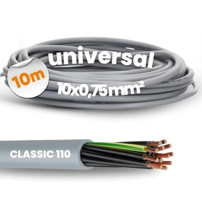 Cable sold by the metre, order 1 piece. Then you will receive 10 m cable. For 3 pieces 30 m etc. The oil-resistant and flexible sheathed cable 10 x 0.75 mm² is suitable for versatile applications e.g. for power tools, DIY machines or household appliances. Our cable 10 x 0.75 mm² is suitable for dry or damp rooms, under normal mechanical stress. The control cable 10 core, also called cable 10 core, for fixed installation as well as occasionally flexible use without tensile stress with free, non-constantly recurring movement. Our 10-core cable 0.75 mm² is suitable for high-quality work in electrical installation. The sheathed cable 10 core has a sheath made of PVC, grey (RAL 7001), VDE registered. Product features for the cable 10 cores: flame retardant according to IEC 60332-1-2. Good chemical resistance. Oil resistant according to DIN EN 50290-2-22 (TM54).