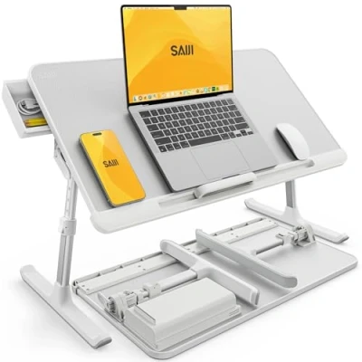 ♻️[Large desktop space] SAIJI laptop bed tray table fit laptops up to 17 ",desktop size 23.6"(L)×12.6"(w ) is suitable for most people, whether entertainment on the sofa or lying in bed to work.the surface of the table is wrapped in PVC leather, can be use mouse directly, and anti-slip, waterproof, scratch-resistant. ♻️[Multi-angle and height adjustment] SAIJI Adjustable laptop stand bed tray has 5 height adjustments: 9.4"-10.2"-11"-11.8"-12.6", you need to press the two buttons in the middle of table legs to adjusting the height; 4 angle adjustment: 0°-12°-24°-36°, the angle adjustment needs to open the two locking buttons on table legs; by adjusting the angle and height, bring you the most comfortable for office or entertainment bed table experience. ♻️[Humanized Design] There is a storage drawer on the left side of the laptop bed tray table, where you can put accessories such as mouse, pencil, earphone, etc. movable Anti-slip laptop stopper to prevent the tablet and mouse slipped,suitable for both left and right hands. ♻️[Multifunctional Use] This multifunctional table will be the perfect addition to your office, home or home office. You can use it work, write or have breakfast on the bed, sofa or floor, you can also use it as a standing desk, a mini writing table,couch desk for reading, floor table for eating, Back to School Supplies. ♻️[Powerful table leg design] Portable foldable bed table:sled table leg design, Ultimate Effortless.when you work on the bed, it is convenient to get up,just push the table forward slightly . The table legs are made of thick aluminum alloy material, which is more durable and stable. The table legs are foldable and only 2.36" thick when folded, making it easy for you to store and portable.