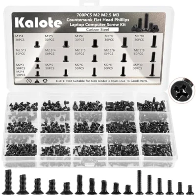 đăReliable Carbon Steel Materială - Kalote laptop screws are made of carbon steel, specifically with high hardness and good corrosion resistance, so our Laptop Replacement Screws are durable and reusable. It helps you easily replace faulty, cracked or damaged screws. đăProvide Complete and Popular Sizesă - Kalote offers you 700 pcs of professional phillips flat head micro laptop screws, each screw is with standard phillips flat head, clear threads, and a variety of sizes, making it a great replacement for laptop screws. Consisting of three popular sizes M2/M2.4/M3, they are 50pcs X M2*3, 50pcs X M2*4, 50pcs X M2*5, 50pcs X M2*6, 50pcs X M2*8, 50pcs X M2*10, 50pcs X M2.5*3, 50pcs X M2.5*4, 50pcs X M2.5*5 , 50pcs X M2.5*6, 50pcs X M2.5*8, 30pcs X M3*4, 30pcs X M3*5, 30pcs X M3*6, 30pcs X M3*8, 30pcs X M3*10 a total of 16 different sizes. They are suitable for almost all types of computers and can be repaired efficiently and accurately. đăBeautiful and Portable Storage Boxă - Kalote puts these laptop screws in a clear and portable plastic storage box with large compartments and small compartments with double-sided clear labels and snaps, which keeps your laptop screws organized and saves your work efficiency, easy and quick to use. đăChoose Kalote Laptop Screws Is The Right Choiceă - Our laptop repair screw kits are perfect for many types of computers fixing the best choice for installation or repair. Whether you are an IT professional or a hobbyist, you can easily use these laptop screw kits to repair or DIY computers and laptops. And for sports equipment; lawn mowers; blowers; and other home and business equipment! đăKalote Satisfaction Lifetime Warrantyă- Kalote specializes in the production and development of fasteners. Our products have undergone rigorous testing, so you can use them with confidence. Additionally, we provide a 1-YEAR WARRANTY and 30 DAYS RETURN GUARANTEE, If you have any questions, please feel free to contact us.
