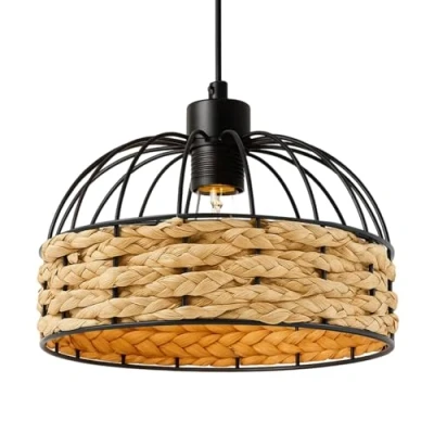MOOD AND FUNCTION IN HARMONY: Single bulb design with metal cage structure provides focused downward lighting whilst creating ambient glow through rope shade. Imagine a light that sets the mood while perfectly illuminating your space. The woven jute shade glows softly, spreading a cozy, bohemian vibe across your ceiling and walls. This unique combination ensures the lamp is not just a decorative piece, but a practical and efficient light source for reading, working, or relaxing. EASY INSTALLATION: Ready to use straight out of the box! This non-electrical pendant lampshade can be easily hung from an existing light fitting or bulb holder—no electrical skills or assembly required. Includes a reducer ring and fits most common socket types (B22, E14, E26, E27). Please note: Bulbs and light fittings are not included. DURABLE & HIGH-QUALITY: Crafted from premium rust-free metal with a sleek black finish, this ceiling light shade ensures long-lasting use. The woven jute rope adds natural texture and warmth, creating a cozy yet eye-catching focal point in any setting. VERSATILE DECOR PIECE: Perfect for enhancing any room—bedroom, living room, kitchen, hallway, dining area, or office. This sophisticated lampshade complements a variety of light fittings and adds a touch of luxury and style to your home or workspace. MODERN RETRO BOHO VIBE: Elevate your interior with large ceiling light shade. Featuring a unique basket-shaped design woven with natural jute rope on a black metal frame, this lampshade effortlessly blends modern, retro, vintage, and bohemian styles for a statement lighting piece., Manufacturer: M.J COMFY-LIFE