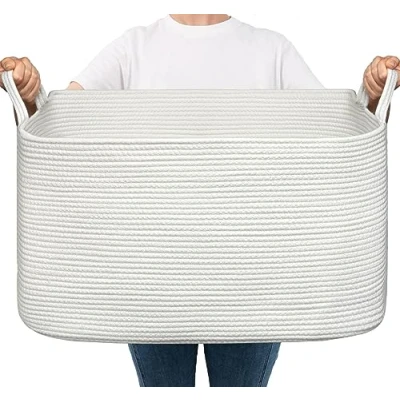 Large Capacity for blankets: 55 x 38 x 30 cm, this storage basket for organizing with 63L capacity is perfect for storing throw blankets, pillow, cushions, clothes, towels and stuffed animals. The blanket basket for living room can also add a style to your bedroom, laundry room and nursery Soft Rope Basket: The woven baskets for storage are made of cotton rope, which is soft yet holds its shape well. No need to worry about scratching clothes or hurting skin, suitable for families with babies or pets Toy Storage Basket with Handles: White storage basket has two sturdy built-in handles to move around. The room organizer works well as toy basket, towel basket, or bathroom organizer. The large laundry baskets are handy to carry laundry up and down the house Perfect Gift Choice: This decorative basket with unique color design blend into any laundry room, and match any bedroom, nursery or living room space well. This large basket will be ideal as a gift basket for babies, kids, moms even pets, and it can be folded or stored at any time to save space NOTE: These white rectangle basket is folded when shipping, but it will turn back to its elegant shape if you fill it with some towels or blankets, and the iron can remove the creases more quickly