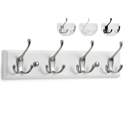 LARHN Wall Mounted Coat Rack 4 Matt Nickel Triple Hooks for on White Wooden Bamboo Base 42 cm All Fixings Included