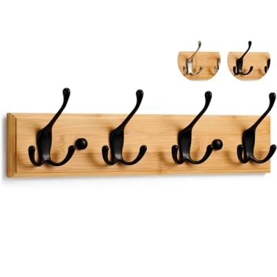 LARHN Wooden Coat Hooks Wall Mounted Rack 4 Triple Black for on Bamboo 42 cm All Fixings Included Quick & Easy Installation