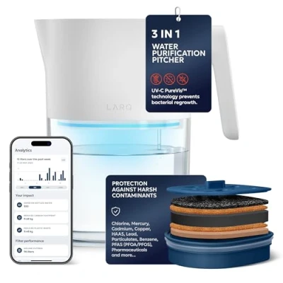 3-IN-1 WATER PURIFIER PITCHER – LARQ PureVis combines Nano Zeto and PureVis technology to provide a premium water purifier for purified water, making it a must-have household essential and advanced water filtration system for clean, safe drinking. UV WATER PURIFIER & LONG-LASTING BATTERY – The built-in UV water filter purifies your water efficiently while the long-lasting battery ensures continuous purification. Perfect as a water pitcher with filter or a UV water purifier for daily hydration. HIGH-CAPACITY FILTER FOR CLEAN WATER – This water pitcher filter reduces chlorine, PFAS, PFOS, mercury, cadmium, copper, lead, benzene, pharmaceuticals, and other particulates, filtering up to 60 gallons. Ideal as pitcher water filters, drink pitcher, or tap water filter for a reliable water filter system. SMART WATER TRACKING – Stay hydrated effortlessly with the LARQ app that tracks your intake. Use this water tracker as a water pitcher for fridge, drink pitcher, or part of your home water filtration, ensuring your water purification is monitored and convenient. RELIABLE DESIGN & WARRANTY – Crafted with durable pitcher water filters, this filtered water pitcher is perfect for hard water filter needs and daily hydration. Comes with a 2-year warranty, making it a trusted solution for water purification and household essentials.