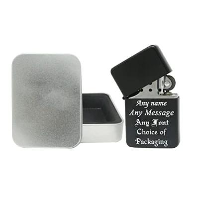 AmazonPersonalised Engraved Black Lighter with choice of font & packaging Once engraved, this becomes the perfect gift for any occasion. Personalised with your choice of font and text, this can be customised to suit your needs. Choose your ideal packaging - From a pouch, a luxury gift box or a sturdy metal tin with a soft black inner to keep your gift safe. These lighters are great for Birthdays, Anniversaries, Valentines Day & Wedding Presents. All lighters sent without fuel for safety reasons. Please note that the lighter will require filling with fluid in order to work