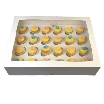 PREMIUM Ultra White Windowed Mini Cupcake Boxes for 24 Cup Cakes & inserts SUPERIOR QUALITY - Made from ULTRA White cardboard material, giving a clean, bright & vibrant finish. The boxes are safe, sturdy, non-toxic, compact, durable, lightweight to keep your cupcake creations safe and secure at all times! CRYSTAL-CLEAR WINDOW - Each box features a crystal clear transparent window to allow you to showcase your bake creations elegantly while still keeping them secure in the box. Allow your beautifully decorated cupcakes / muffins be the star of any show! REMOVABLE INSERTS - Each box comes with a fully removable insert to securely hold 24 Mini cupcakes. Each hole in the insert measures approx 3.5cm in diameter which will ensure that your bakes are kept secure during transport. With the inserts being removable, you can choose to remove the inserts if you would like to allow for larger cakes to fit inside the box. VALUE PACKS - Choose from a pack of 1, 2, 5 or 10. Each box measures 33cm x 24.2cm x 7.6cm (13" x 9.5" x 3"), which give you plenty of space for your baking creations without taking too much of your space.
