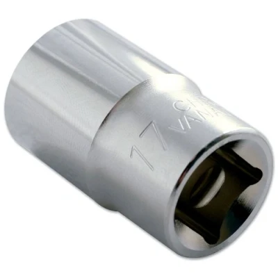 Size: 17mm single Hex x 1/2"D. Standard socket, depth: 38mm. Hex (6pt) head drives from the flats to provide more torque, ideal for damaged or seized nuts & bolts. Manufactured from chrome vanadium with a polished finish. Part of a range of standard sockets available individually. For other sizes, please see Laser Part Nos. 0806- 0823 (10mm to 32mm).