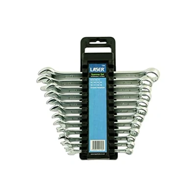 Sizes: 8, 9, 10, 11, 12, 13, 14, 15, 16, 17, 18 and 19mm. Bi-Hex (12pt) profile with 15° offset head for faster and easier use in tight spaces. Supplied in a spanner clip for convenient wall, drawer or tool box storage. Clip size: 240mm x 70mm. Manufactured from chrome vanadium with satin finish and polished jaws. Laser Tools offers a full range of combination spanners from miniature 3.2mm up to heavy duty 105mm in both sets and as individual spanners.