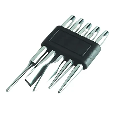 Parallel pin punch - overall length: 150 mm, shaft length: 61 mm, tip diameter: 38 mm Cold chisel - overall length: 130 mm, shaft length: 44 mm, tip width: 12 mm Utility chisel - overall length: 130 mm, shaft length: 54 mm, tip width: 54 mm Taper punch - overall length: 120 mm, shaft length: 53 mm, tip diameter: 28 mm Centre punch - overall length: 118 mm, shaft length: 52 mm, tip diameter: 375 mm