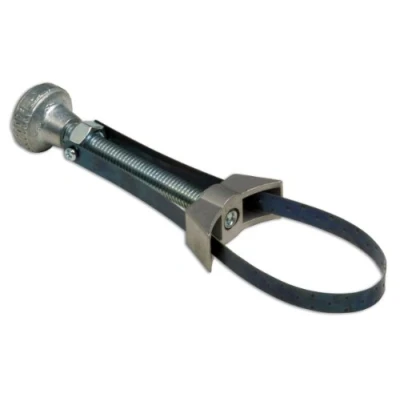 Adjustment range: 110 - 155mm. Easy adjustment using turning knob on handle. Suitable for older style oil filters. Spare metal band available - please see Laser Part No. 0218. Smaller band wrench also available. Please see Part No.2830.