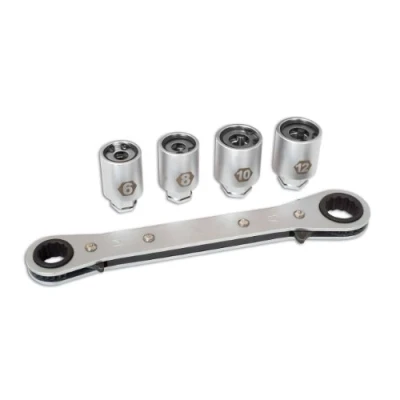4 x stud extractors and a Go-thru' ratchet spanner (14 and 17mm) Sizes: 6mm (OD 239mm), 8mm (OD 238mm), 10mm (OD 278mm), 12mm (OD 278mm) Spare stud extractors available, please See Laser Part Nos 1358 (6mm), 1359 (8m), 1360 (10mm), 1361 (12mm) Supplied in a blow mould case