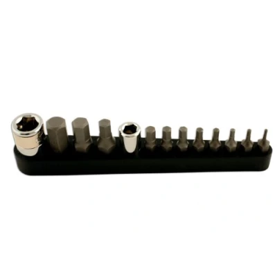 1/4"D bits: 15, 2, 25, 3, 4, 5, 55mm 10mm Hex drive bits: 7, 8, 10mm Supplied with two bit adaptors: 1/4"D x 1/4" Hex and 3/8"D x 10mm Hex Adaptors manufactured from chrome vanadium, bits from impact grade S2 steel Supplied in a bit holder for storage