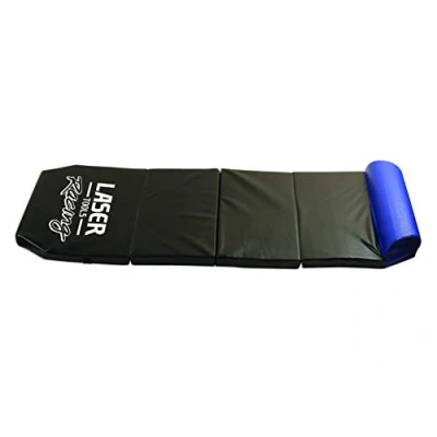 Size: 1200mm x 435mm x 40mm. Folded size: 355mm x 435mm x 140mm. Head rest support for improved comfort when working under vehicles. Thick cushioned construction for comfort. Handles for manoeuvrability and storage. Laser Tools Racing branded product.