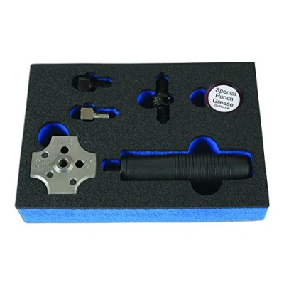 The flaring tool kit includes dies and punches tailored for the two most common brake pipe sizes: 4.75mm and 3/16". This makes it suitable for a wide range of automotive applications, enhancing its practicality. Additionally, a pot of punch grease is provided, further facilitating the flaring process and ensuring smooth operation.