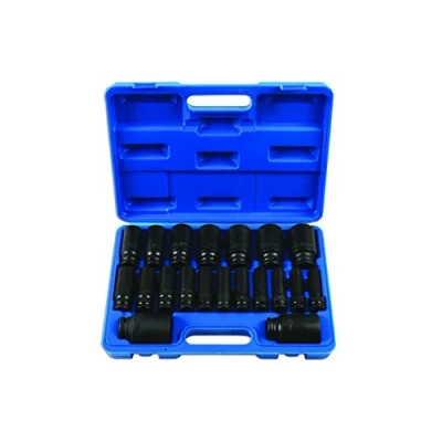 Socket sizes: 10, 11, 12, 13, 14, 15, 16, 17, 18, 19, 21, 22, 24, 27, 30, 32, 33, 34, 36 and 38mm. 1/2"D x Bi-Hex (12pt) x 78mm deep. Hardened and tempered sockets designed for impact use; manufactured from chrome molybdenum with black phosphate finish. Supplied in storage case (250 x 350mm). Ideal for use with Laser cordless impact wrench, Part No. 8013 or mini air impact wrench 1/2"D, Part No. 7681.
