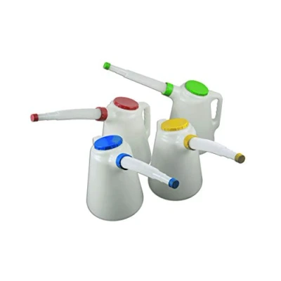 Complete with coloured dust caps to identify oils and prevent contamination: Blue, Green, Red, Yellow. Manufactured from polyethylene. Metric and imperial measurement. Flexi spout., Weight: 5.4233716452 Pounds, Manufacturer: Laser Tools