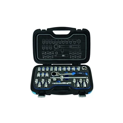 14 x 1/2"D sockets: 10, 11, 12, 13, 14, 15, 16, 17, 18, 19, 21, 22, 24 and 27mm. 10 1/2"D bits: Hex 5, 6, 7, 8 and 10mm; Star* T30, T40, T45, T50 and T55. Accessories include: 1/2"D Go-Thru ratchet spanner, 1/2"D sliding T-bar, extension bar (125mm long) and a 1/2"D quick release adaptor. Storage case includes set contents for easy identification of required tool.