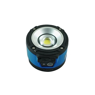Aluminium front housing with rubber coated finish and 360° rotatable base with strong magnetic base & nylon hook. Brightness 600lm (high) - 300lm (low). Working time: 1.5 hours (high), 3 hours (low). Charging time: 4 hours. Built in rechargeable 2600mAh Li-ion battery, supplied with USB charging cable. CE & RoHS compliant. IP65 waterproof.