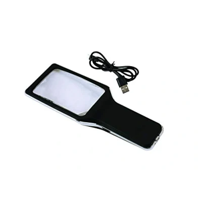 Large, horizontal crystal clear lens with 4x magnification. Lens size: 114 x 63.5mm; overall size: 80 x 225 x 20mm. USB rechargeable 10 ultra bright LED lights with dimmer switch for ease of reading/viewing. Standby time (under max brightness): 8-12 hours. Charging time: 1.5-2 hours. Red light indicates charging, green light indicates full charge. Supplied with USB lead (80cm) and protective microfibre pouch for safe storage & easy cleaning.