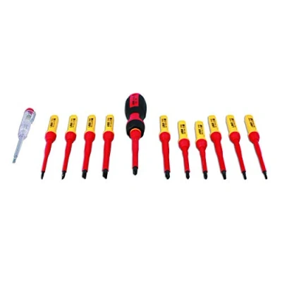 1000V certified screwdriver handle with 11 interchangeable blades, connect with simple push to fit, twist to release Contents: 2 x Phillips blades: Ph1 x 80mm, Ph2 x 100mm 4 x Flat blades: 05 x 3mm, 08 x 4mm, 1 x 55mm, 12 x 65mm; shaft length: 100mm 2 x Pozi Drive blades: Pz1 x 80mm, Pz2 x 100mm 3 x Star* blades: T10, T15, T20; shaft length: 100mm Supplied with single-pole voltage tester (110-250V) Manufactured to IEC60900 VDE/GS approved