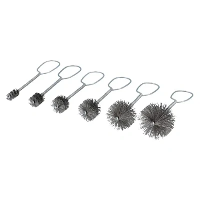 Stainless steel brush set, for cleaning & corrosion removal. Brush diameters: 13, 19, 25, 31, 41, 50mm. Overall length: 153mm. Brushes manufactured from stainless steel with a durable galvanised iron shaft & handle. Ideal for engine rebuilds etc.