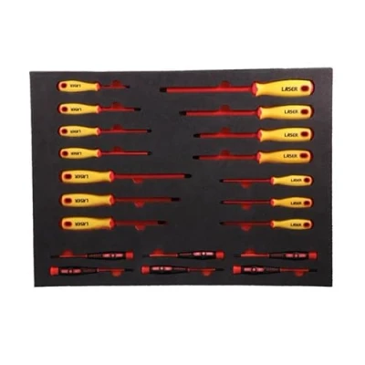Set contents: Flat: 3, 4mm x 100mm, 5.5 x 125mm, 6.5 x 150mm; Phillips: Ph0 x 60mm, Ph1 x 80mm, Ph2 x 100mm (Part No. 5986). Star*: T10, T15, T20, T25, T27, T30, T40 (Part No. 7448). Precision electrical screwdrivers: Flat: 2, 2.5, 3mm x 65mm long; Phillips: Ph1, Ph0, Ph00 x 65mm long (Part No. 7612). Manufactured to IEC60900 standards, for safe operator use on live voltages up to 1000V AC / 1500V DC. VDE certified. Presented in a high density PU foam tool organiser tray (563 x 409 x 37mm) & designed to fit a standard sized roller cabinet drawer, such as including Laser Part Nos. 5083 & 8248.
