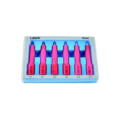 Sizes: M4;M5;M6;M8;M10 and M12 x 120mm long in 3/8"D. Safe operator use for live voltages up to 1000V AC / 1500V DC. IEC60900:2018 approved for 1000V safe working. Sockets manufactured from chrome vanadium (50BV30);bits manufactured from S2 steel with a zinc phosphate finish. Presented in an EVA foam tray (36 x 149 x 225mm) convenient for user storage and limiting packaging waste. Suitable for use with the Laser Tools fully insulated 3/8"D ratchet (Part No. 8414) and fully insulated click type torque wrench (Part No. 8321).